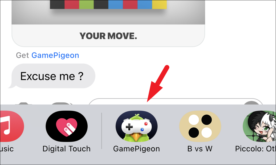 After that, scroll from left to right on the revealed bar to locate the ‘GamePigeon’ app and tap on it. It will reveal a grid of games on your screen.