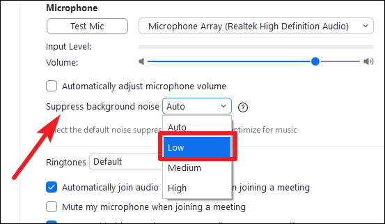 Now, go to the ‘Suppress background noise’ option and click on the drop-down menu next to it. Previously, you could disable it entirely. But now, there is no such option, and it can confuse many users. Select the option ‘Low’ to optimize your audio for music instead.