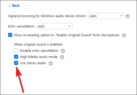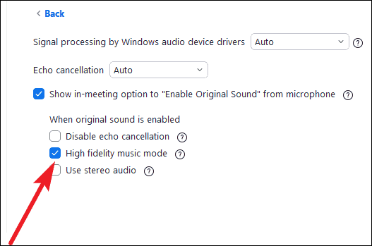 For those who do have a professional audio interface, microphone, and headphones, enable the option for ‘High fidelity music mode’. It will optimize your Zoom audio for the highest music quality. But remember that enabling this setting can increase CPU utilization and bandwidth consumption. Zoom advises you to use this setting on an ethernet connection instead of Wi-Fi if you can.
