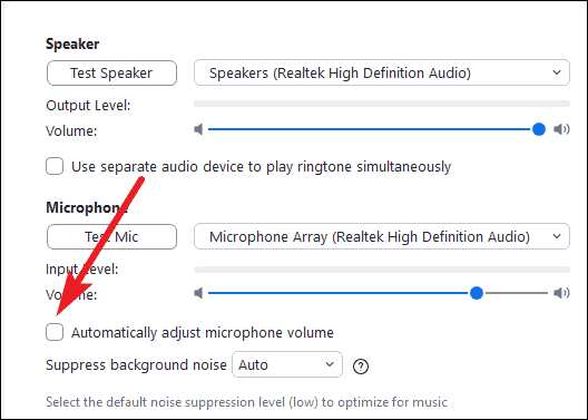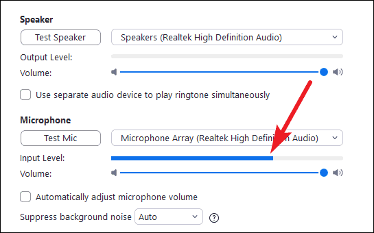 But after you disable the option, it’s important to make sure that the volume isn’t too high either to be damaging for other meeting participants. Try your instrument with the settings still open. You’ll see a blue bar on the right of the ‘Input Level’ option that varies according to sound. Make sure it doesn’t rise too high. If it does, adjust the volume slider for the microphone beneath the input level. The ideal setting for the volume is when the bar only reaches somewhere between the middle and the end, and not all the way.