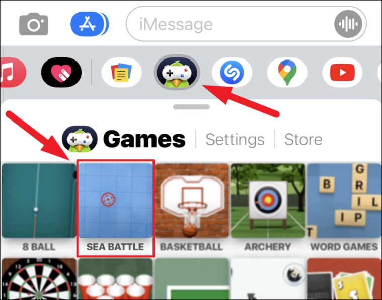Then, scroll the ‘App Drawer’ present on the top of your keyboard and tap on the ‘GamePigeon’ icon. Next, tap to choose the ‘SEA BATTLE’ tile from the grid of options.