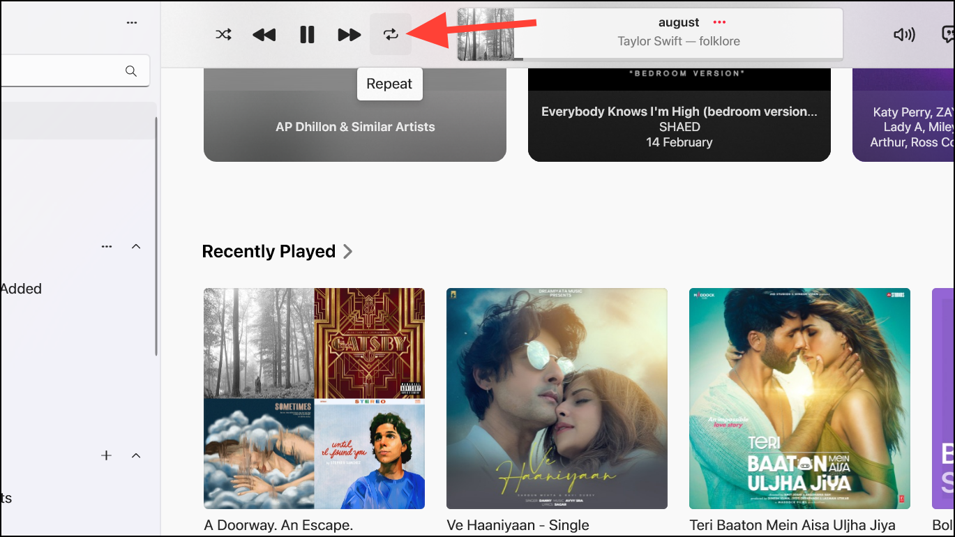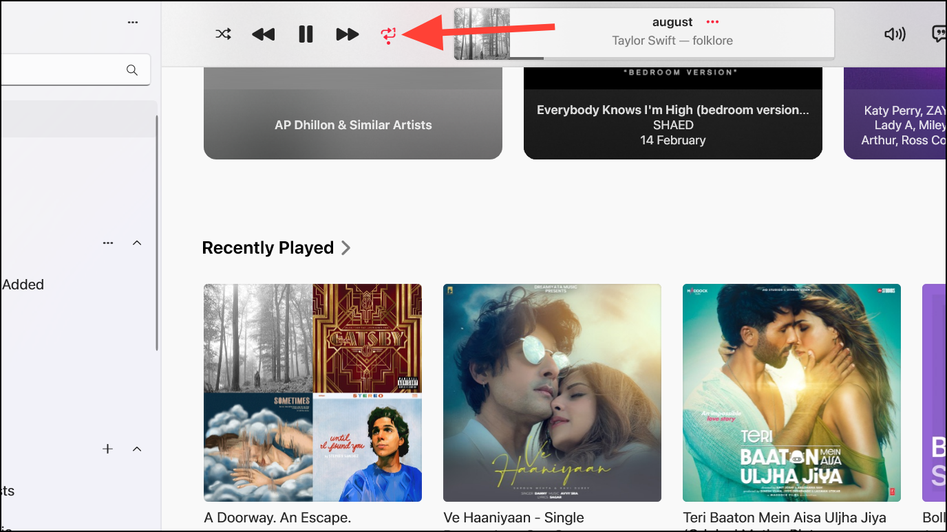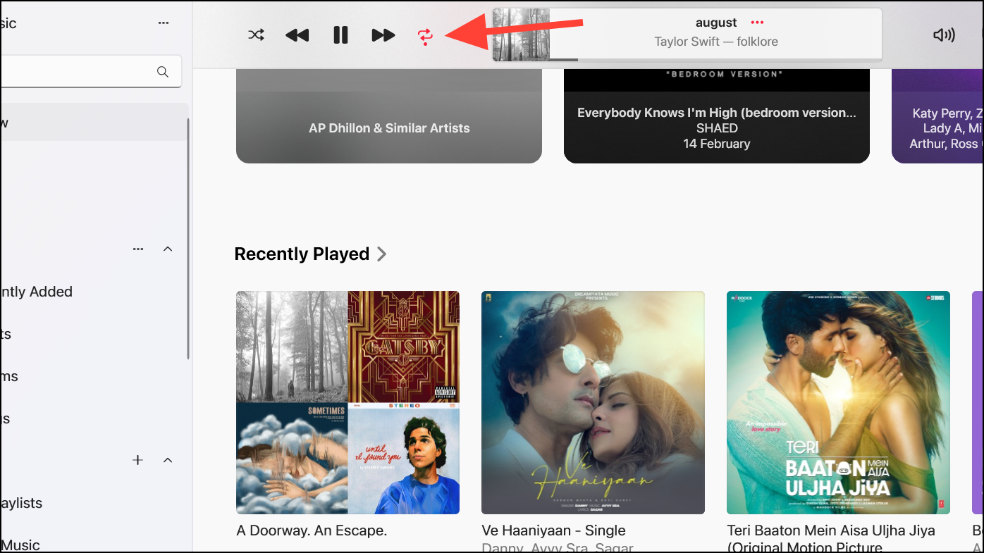 - Next, go to the top part of the Apple Music Window that houses the playback controls and click the 'Repeat' button. This icon looks like two arrows forming a circle.