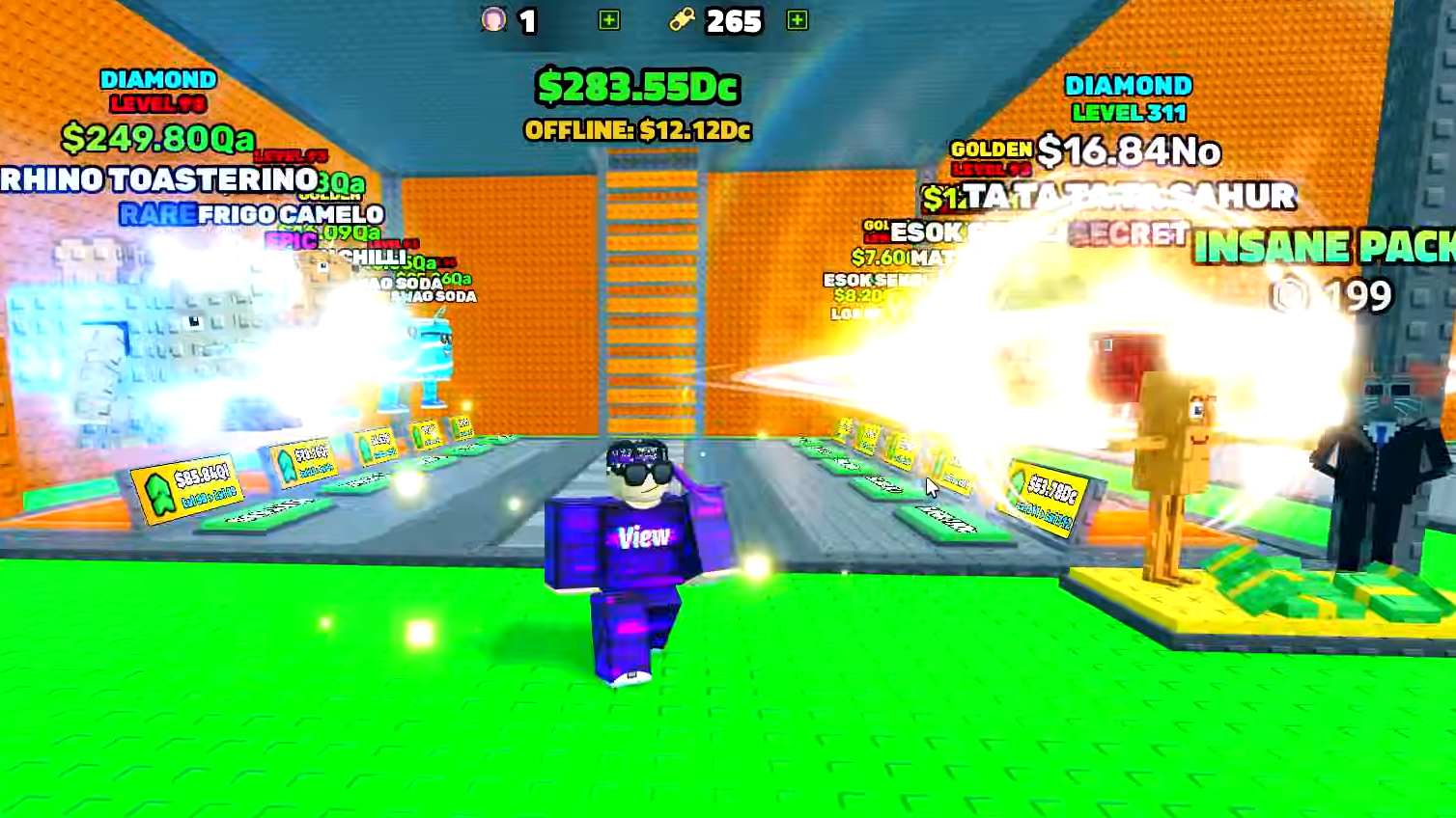 Once a brainrot is placed at your base, you can level it up by clicking the banner in front of it. Each level costs money and increases how much that unit earns per second. There is no confirmed maximum level — players have pushed units past level 300 and beyond without hitting a cap. The income scaling is dramatic: a brainrot from the 1,000x Luck zone starting at billions per second can reach trillions or more with enough levels pumped into it.