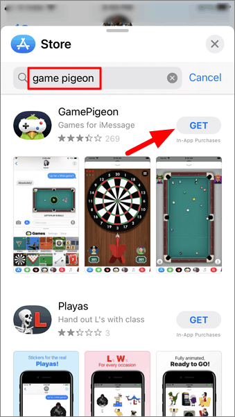 Step 2: In the App Store that appears within Messages, tap the search icon and type GamePigeon into the search bar. Locate GamePigeon in the results and tap the Get button next to it to download the extension.