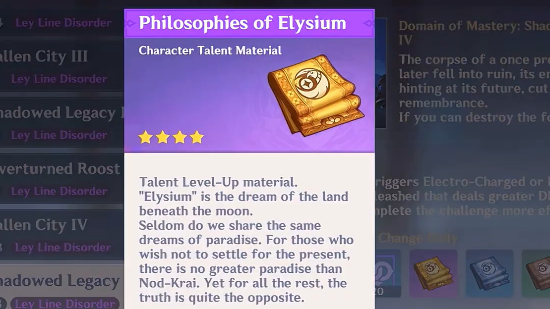Teachings of Elysium, Guide to Elysium, and Philosophies of Elysium are available from the Nod-Krai talent domain on Tuesday, Friday, and Sunday. The total requirement for triple-crowning is steep — 9 Teachings, 63 Guides, and 114 Philosophies — so spreading your domain runs across multiple weeks is the most resin-efficient approach. Sunday runs let you choose which book series drops, making it a flexible catch-up day.
