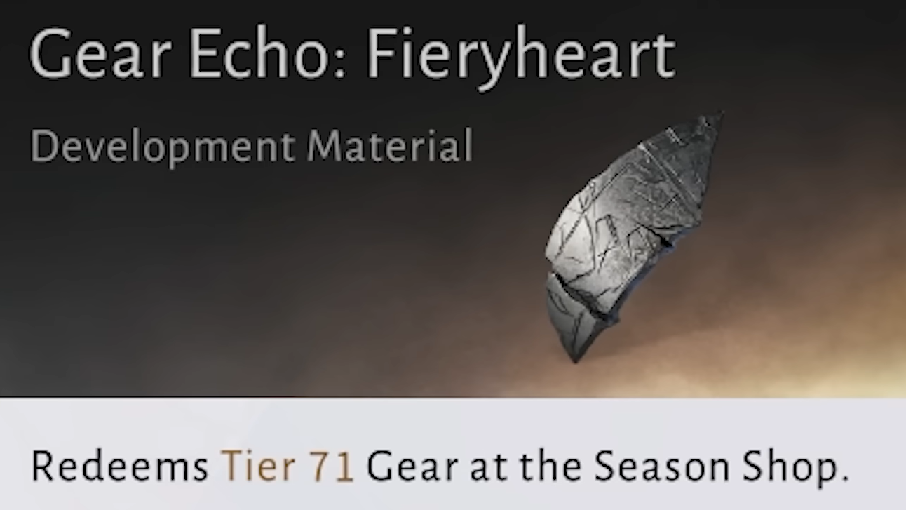 Gear Echo: Fiery Heart drops from Tier 71 Sword Trial clears and from other energy-using activities, such as outposts and campaign boss runs set to the new breakthrough. It is spent in the seasonal shop, which receives several powerful upgrades around this tier.