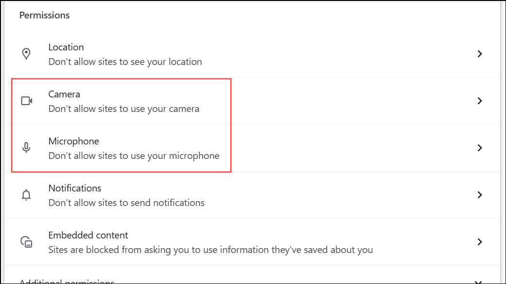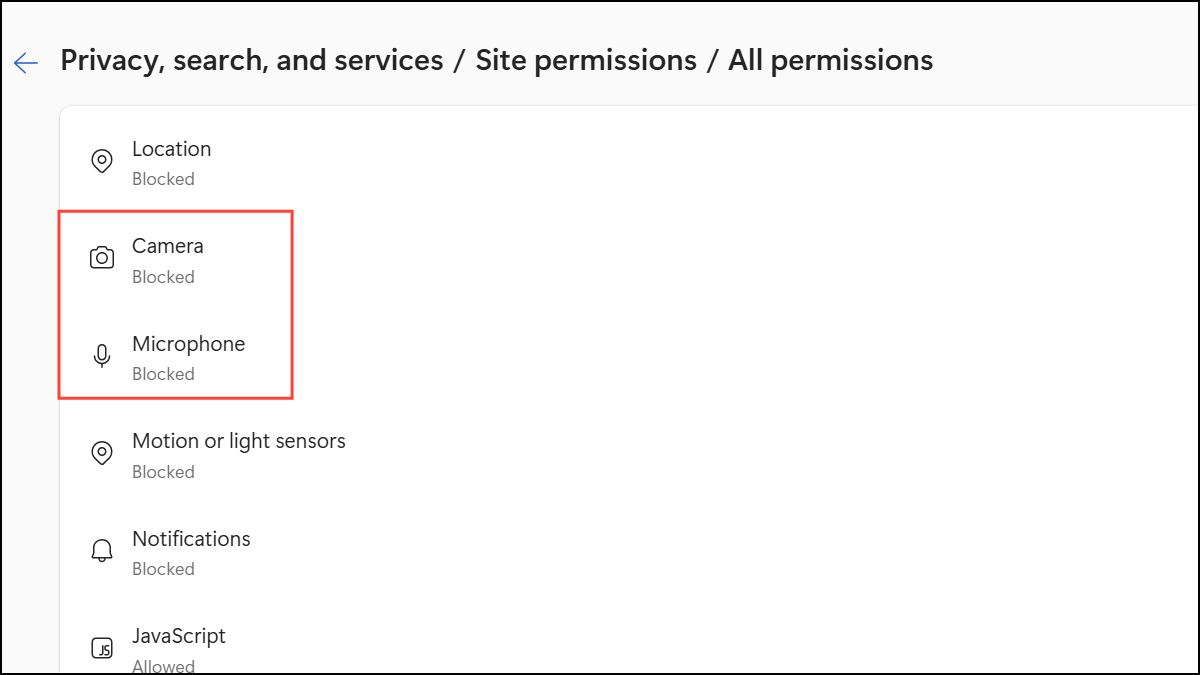 Step 3: Scroll down to the Permissions section, then click Camera and Microphone individually. Here, you can review which sites are allowed or blocked from accessing your devices.