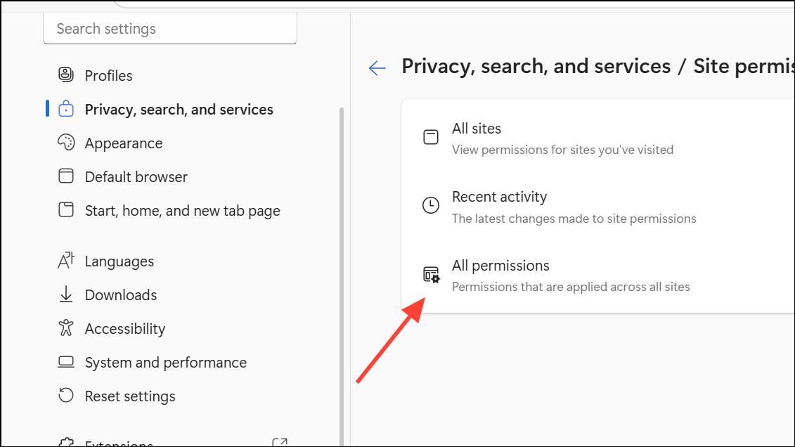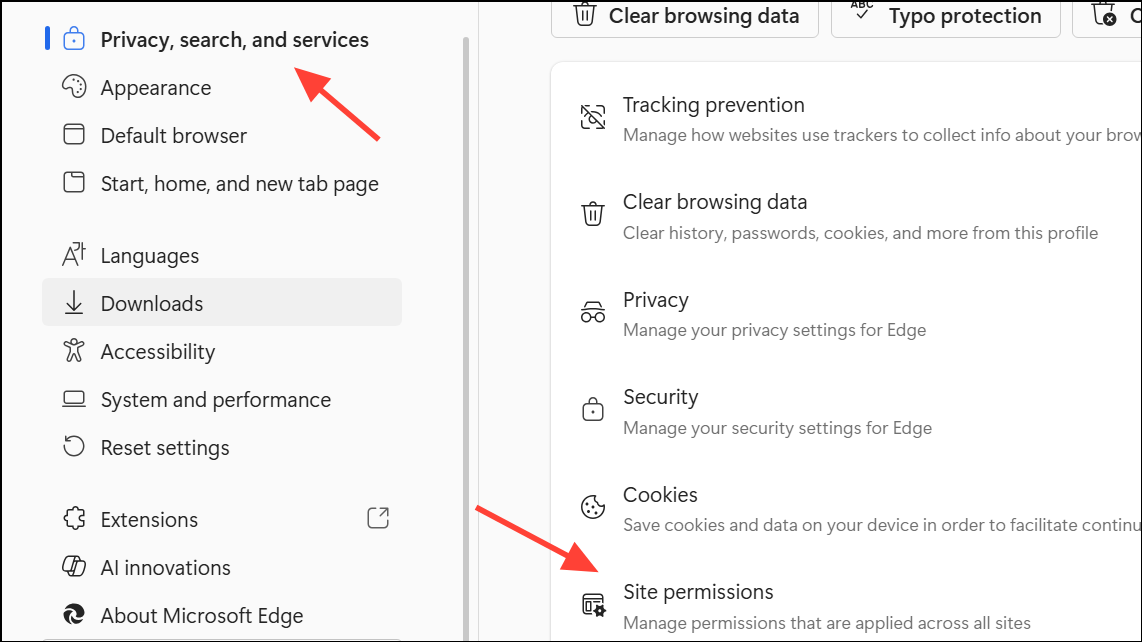 Step 2: In the left sidebar, choose Privacy, search and services and then select Site permissions on the right. This area manages site-specific permissions, including camera and microphone access.
