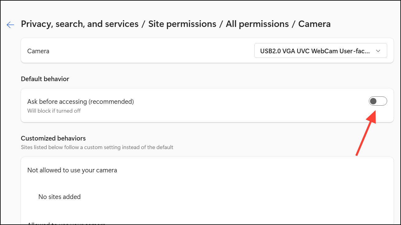 Step 5: Turn off the Ask before accessing (recommended) toggle to disable access permissions for your camera or microphone. This prevents new requests for camera or mic access from websites.