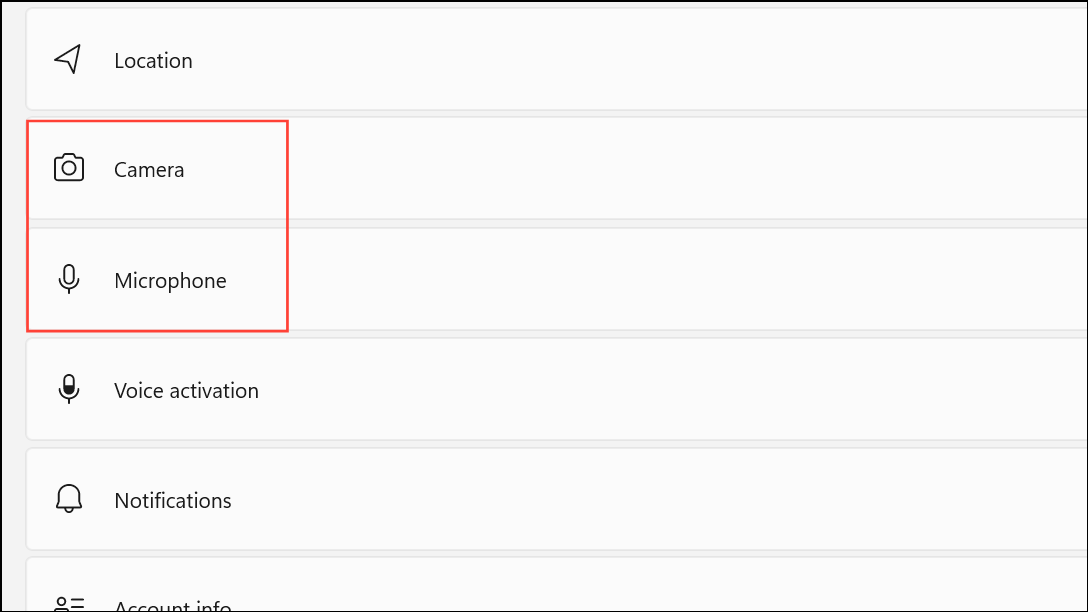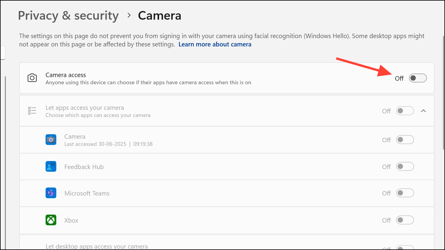 Step 3: Toggle Camera access for this device and Microphone access for this device to Off if you want to block all access. For more granular control, leave these on but disable access for specific apps you don’t trust.