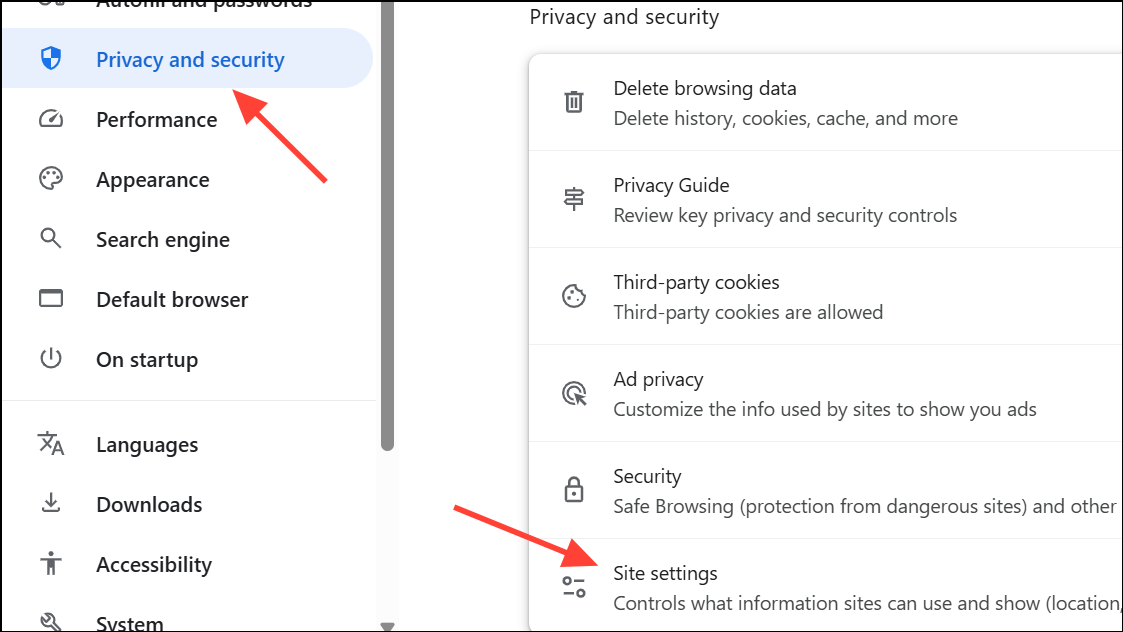 Step 2: Select Privacy and security on the left sidebar, then click Site settings. This section manages permissions for websites, including camera and microphone usage.