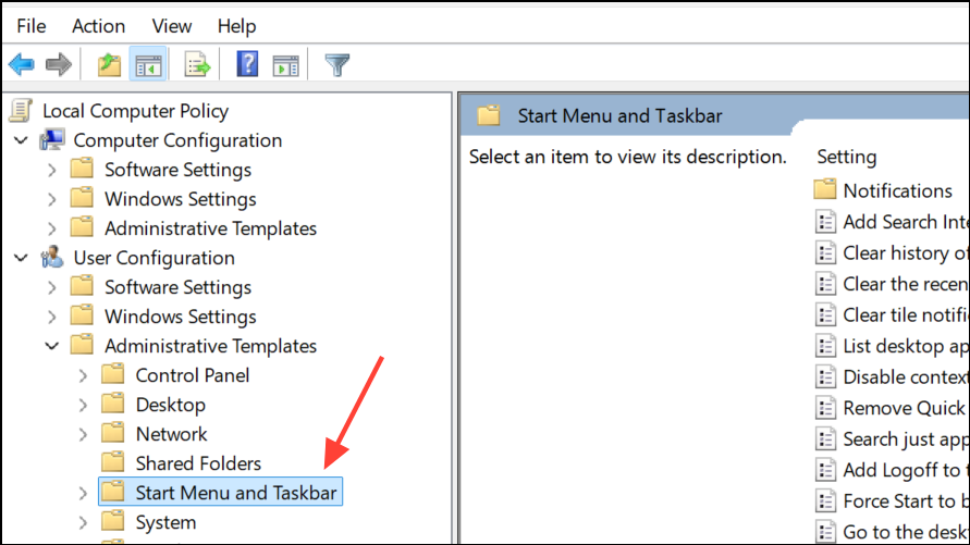 Step 2: In the Group Policy Editor, navigate to User Configuration > Administrative Templates > Start Menu and Taskbar. This section contains taskbar and Start menu-related settings.