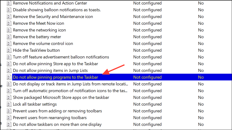 Step 3: Find and double-click the policy named Do not allow pinning programs to the Taskbar. This policy, when enabled, prevents users from pinning or unpinning any programs to the taskbar. It applies to all users on the device, including administrators, unless the policy is specifically disabled or filtered.