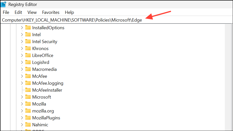 Step 2: In the Registry Editor, browse to HKEY_LOCAL_MACHINE\SOFTWARE\Policies\Microsoft\Edge. If the Edge key does not exist, right-click the Microsoft folder, select New > Key, and name it Edge.