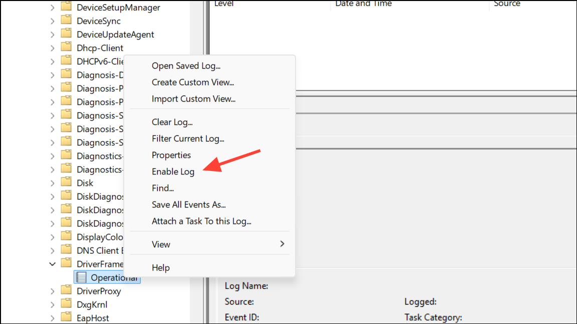 Step 3: Launch Windows Event Viewer (eventvwr.msc). Navigate to Applications and Services Logs > Microsoft > Windows > DriverFrameworks-UserMode. Right-click “Operational” and select “Enable Log.” This will allow the system to record device connection events.