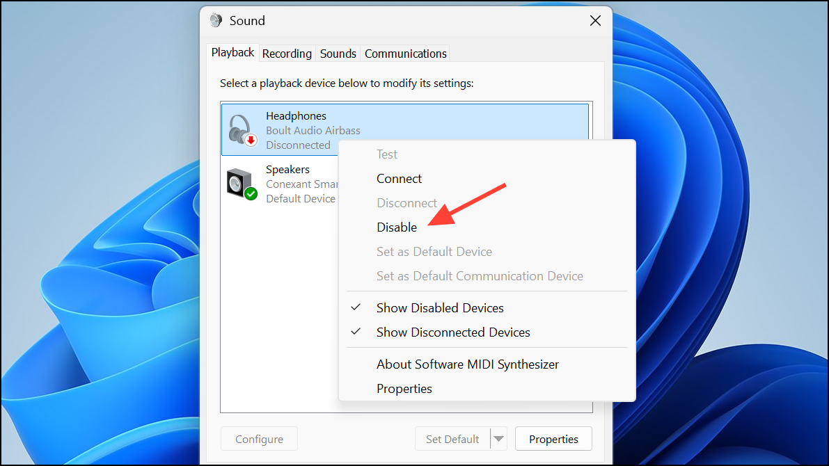 Disabled devices will not be set as default, even if reconnected. To use them again, right-click and select “Enable.”