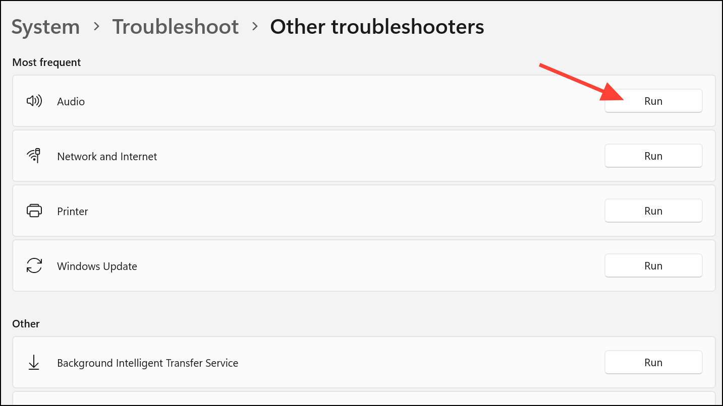 Step 2: Click “Run” next to “Audio” and follow prompts to select your preferred device and apply fixes.