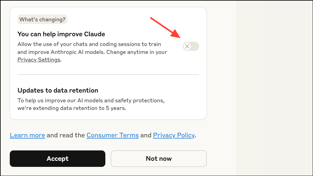 Step 2: Carefully review the pop-up before clicking "Accept." Make sure the toggle for model improvement is switched off. The toggle should show an X or be set to the left, indicating opt-out status. Only after confirming the toggle is off should you proceed to accept the terms. This action ensures your new and resumed chats are excluded from training.