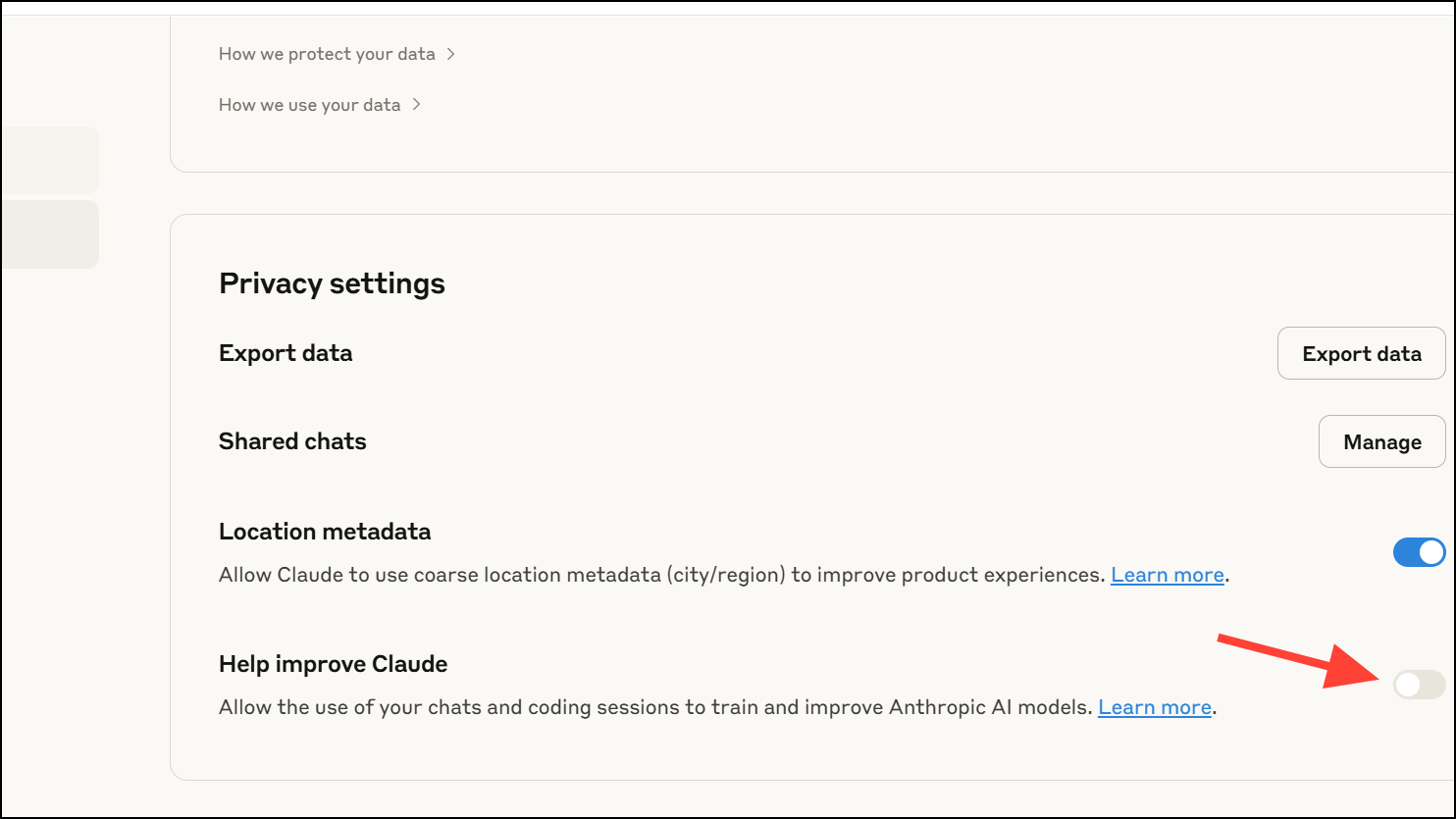 Step 3: If you’ve already accepted the new terms or missed the toggle, you can still change your preference. Open Claude, then navigate to Settings > Privacy > Privacy Settings. Find the "Help improve Claude" or similar toggle and set it to off. This setting change will prevent future chats and coding sessions from being used in model training. However, any data collected while the setting was on may already be included in ongoing or completed model training cycles.