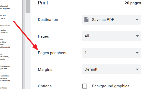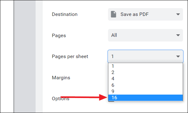 Step 3: Click the dropdown menu next to Pages per sheet and select the number of pages you wish to include on one sheet. Google Docs provides options ranging from 1 to 16 pages per sheet.