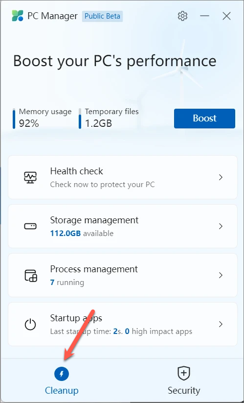 Step 1: Open PC Manager if it's not already running. Ensure you're on the 'Cleanup' tab within the PC Manager window.