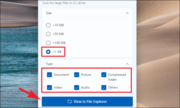Step 4: In the 'Manage large files' window, choose the size category of files you want to locate. For instance, select the radio button next to '>1 GB' to search for files larger than 1 GB. Next, choose the file types you're interested in by checking the boxes next to the relevant categories (such as documents, videos, or images). After making your selections, click 'View in File Explorer'.