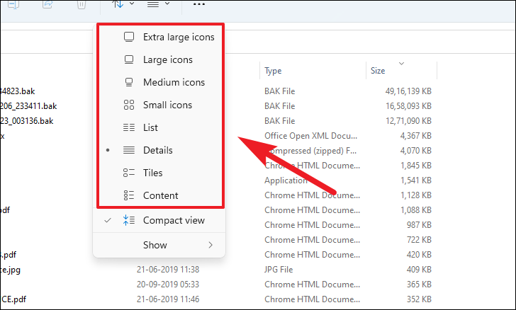 - If you prefer a more condensed view, you can enable the 'Compact view' option from the layout menu. This reduces the spacing between items in File Explorer, allowing more files to be displayed on the screen.