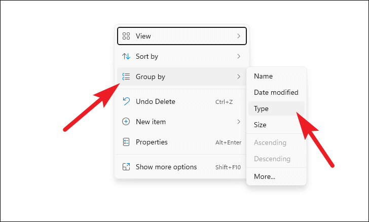 - Hover over the 'Group by' option and select an attribute to group the files by, such as 'Type'.