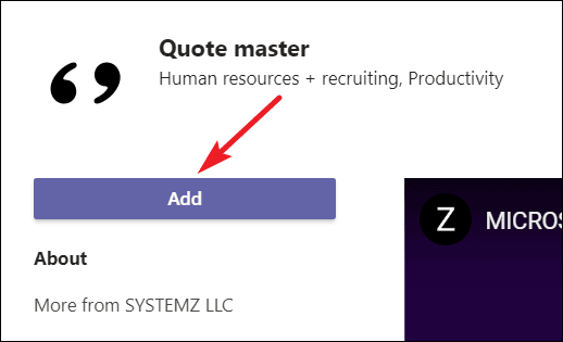 In the pop-up dialog of the Quote Master app, click the ‘Add’ button to install the app in your Microsoft Teams account.