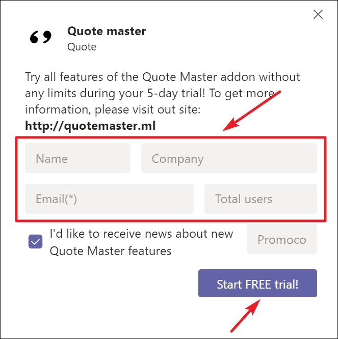 While using Quote Master for the first time, you need to provide certain information like your name and email address to start a free trial of the service. After the trial period, you can still use Quote Master with some limitations.