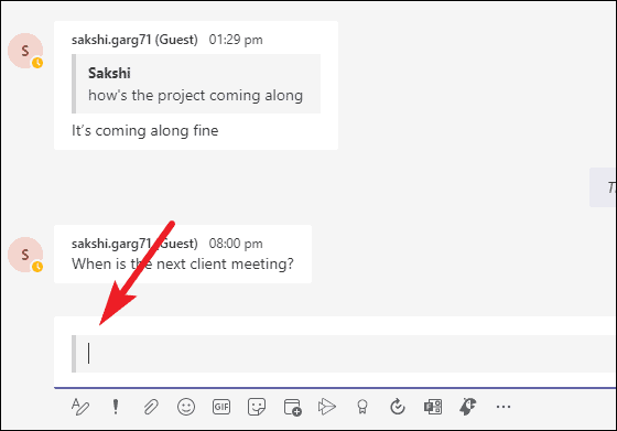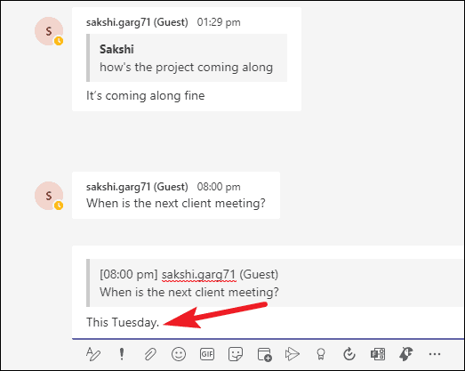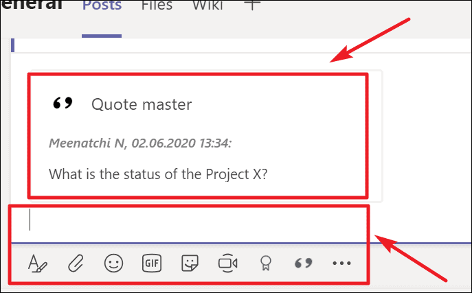 After clicking Quote, the message you had selected earlier will be displayed in quotes. Below that, you can see a text box along with the message toolbar, to add a reply for that message.