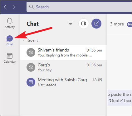 Switch to your personal account on the Microsoft Teams desktop or web app. Then, go to the ‘Chat’ tab from the navigation menu on the left and open the chat you want to reply to the message to.