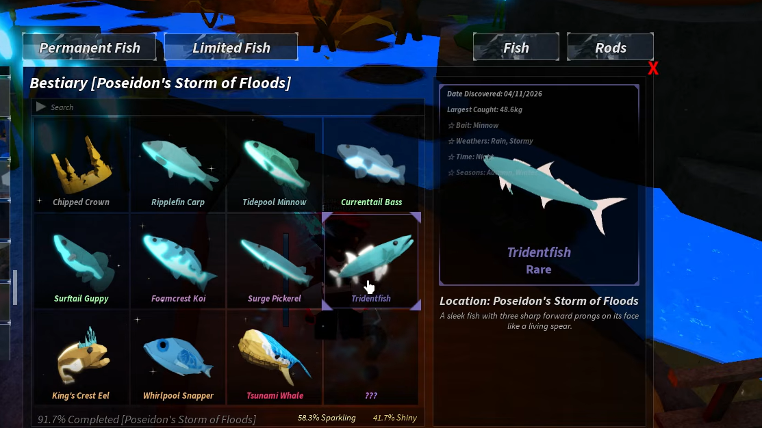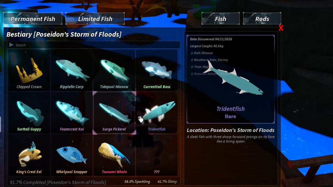 Poseidon's Storm of Flood contains 12 fish spanning common through exotic rarities. Notable catches include the Tridentfish, which is one of the rarer entries and a frequent sticking point for players trying to hit 100 percent completion. The Tridentfish does not require a special rod, but its low spawn rate means you may need patience and luck-boosting potions.