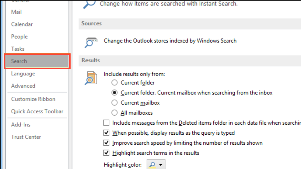 Step 1: Open Outlook and navigate to File > Options > Search. This section manages all search-related settings in Outlook.
