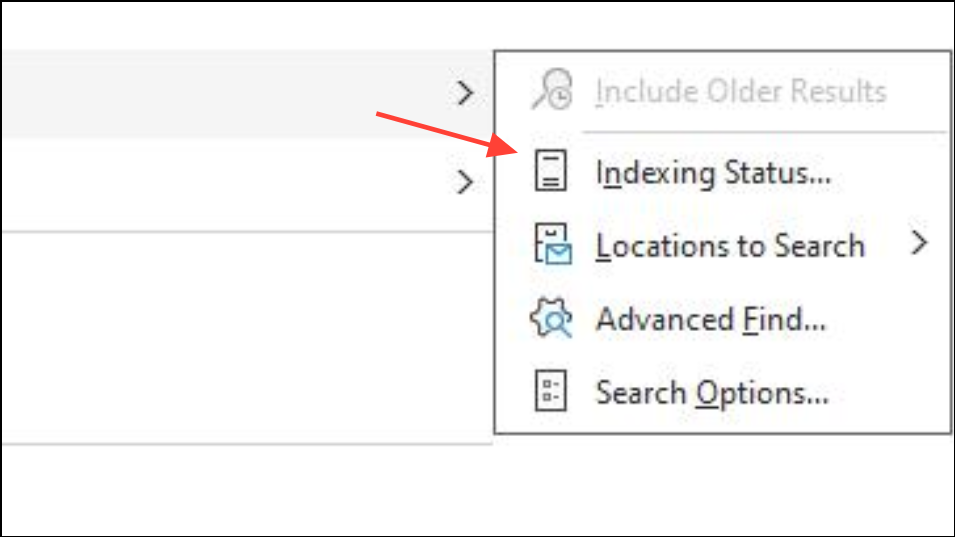 Step 4: Wait for the process to complete. You can monitor progress by clicking in the Outlook search box, then selecting Search Tools > Indexing Status. The dialog will show how many items remain to be indexed. Searches may return incomplete results until indexing finishes.