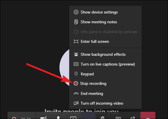 To stop a recording, again go to the ‘More’ option (three dots) on the meeting toolbar and click ‘Stop Recording’ from the menu.