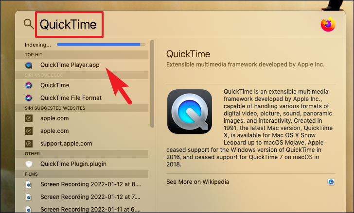 Alternatively, you can press Command+Space to bring spotlight search and type Quicktime in it. Then, press Return to open the app.
