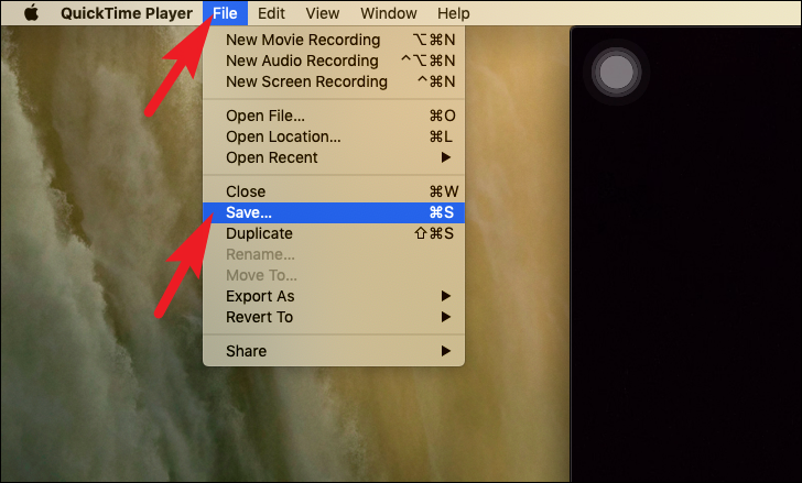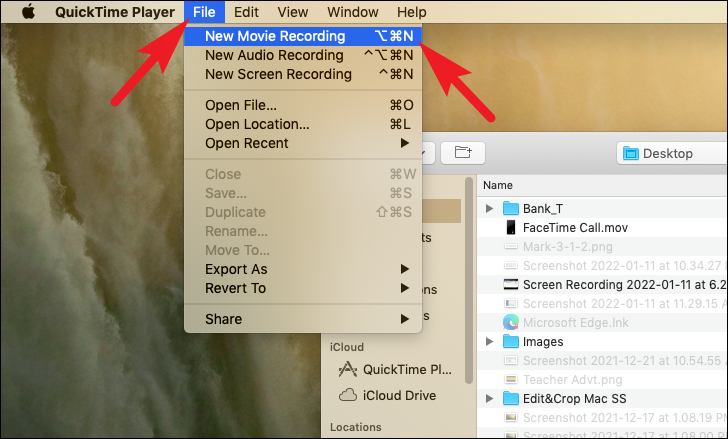 Once QuickTime player is open, click on the ‘File’ tab present on the Menu bar in the top right section of your screen to reveal an overflow menu. Then, click on the ‘New Movie Recording’ option to continue. This will turn on your built-in camera and open a separate window on your screen.