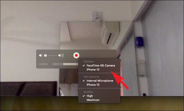 Then, from the separately opened window, click on the little chevron present right next to the ‘Record’ button present on the toolbar to reveal the context menu. Then, under the ‘Camera’ section click to select your iPhone name from the list. You shall now see your iPhone screen on the QuickTime player window.