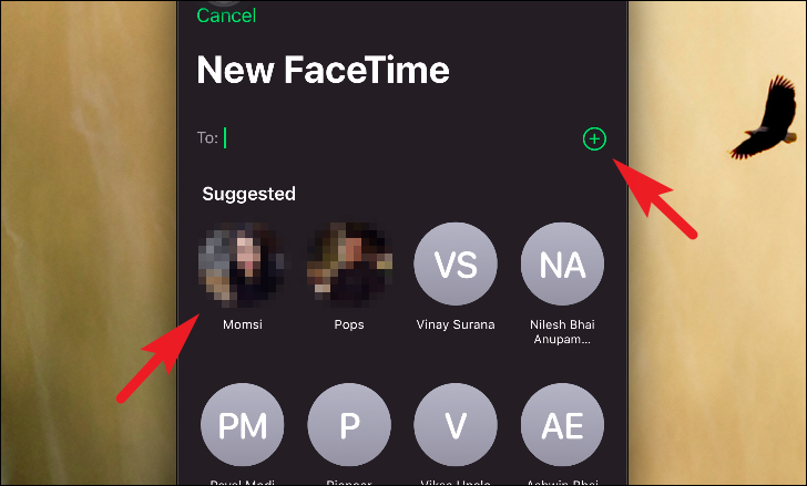 Next, either tap on a contact present on the recent contact list to place a call or tap on the ‘+’ button to browse a contact from your contact list.