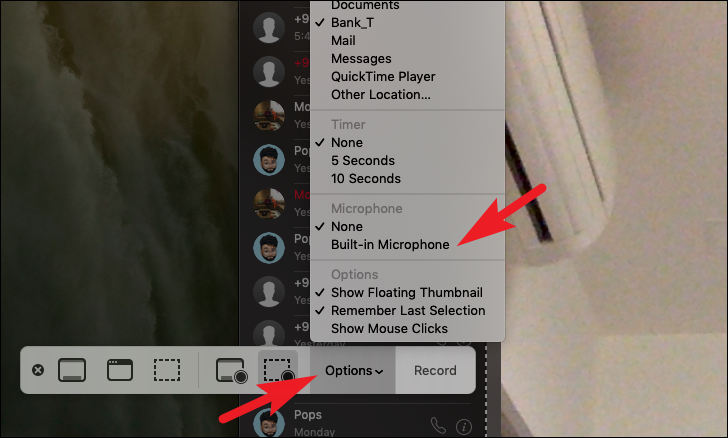 Now, from the screenshot toolbar, click on the ‘Options’ tile to reveal an overflow menu. Then, under the ‘Microphone’ section, click to select the ‘Built-in Microphone’ option.