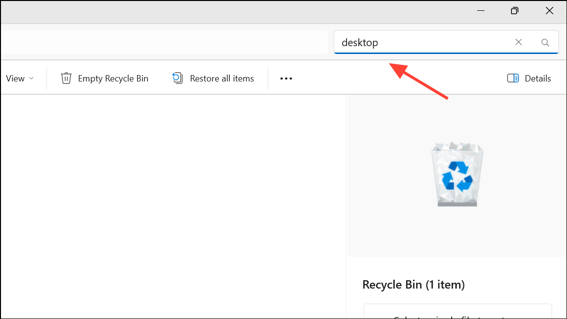 Step 2: Use the search bar in the Recycle Bin window to look for "Desktop" or browse the list for your deleted Desktop folder.