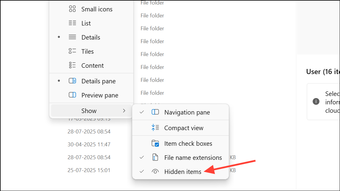 Step 2: Navigate to C:\Users\[Your Username]. If the Desktop folder is not visible, click the View tab and check the Hidden items box to show hidden folders.