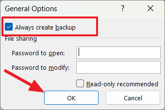 After that, check the ‘Always create backup’ box in the General Options dialog and click ‘OK’.