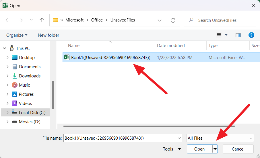 This will take you to the ‘UnsavedFiles’ folder where Excel has saved all the unsaved workbooks. If you have more than one file, you can identify your file with the date and time. Now, select the file you want to recover and click the ‘Open’ button.