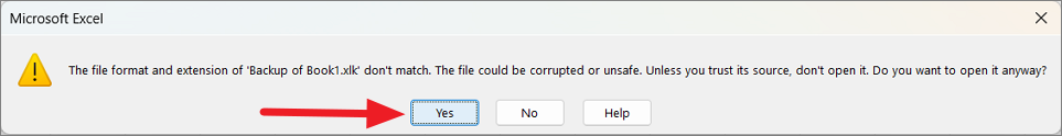 You can also rename the file extension of the backup file from ‘.xlk’ to ‘.xlsx’ and open it normally.