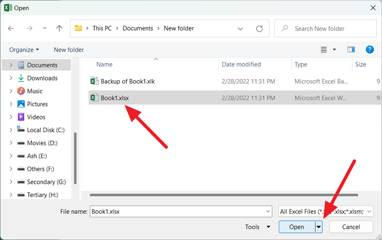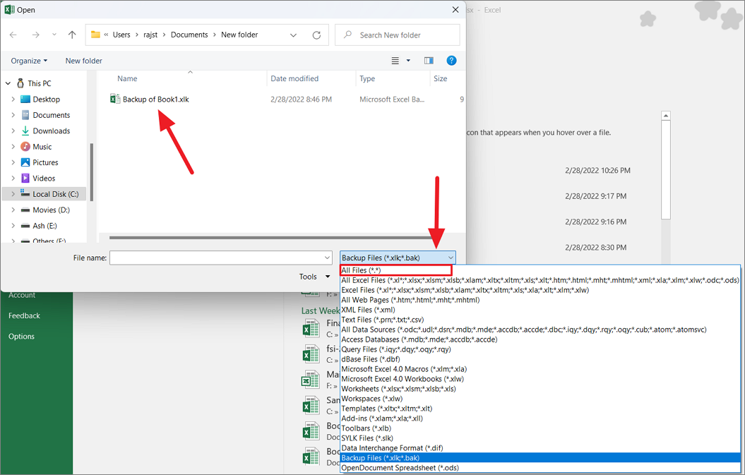 From the drop-down list, either select ‘Backup files (*.xlk;*.bak)’ or ‘All Files (*.*). Then, select the backup file and click ‘Open’.