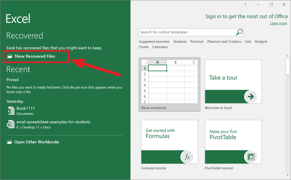 Open any of the existing Excel Workbook or the Excel application. If the Excel program opens up in Excel backstage window, click the ‘Show Recovered Files’ option under the ‘Recovered’ section on the left pane.
