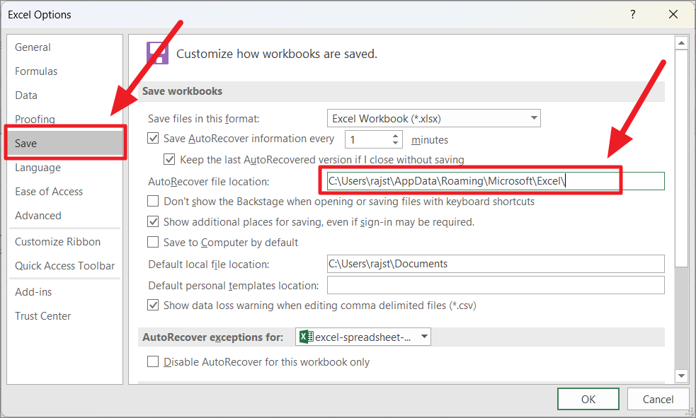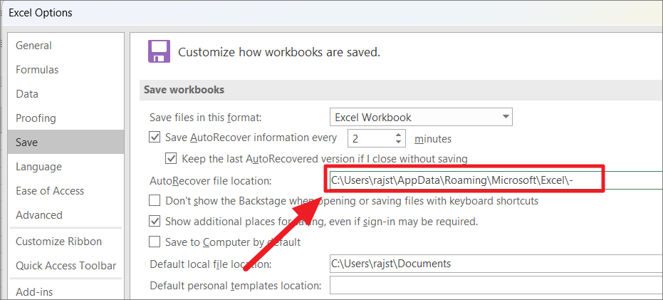 In the Excel Options dialog box, click on the ‘Save’ section on the left side panel. Then, find ‘AutoRecover file location:’ under the Save workbooks section and copy the path from the field.