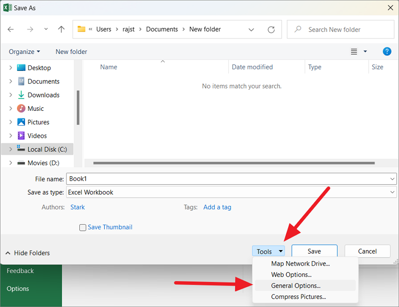 In the Save As dialog box, navigate to the folder where you want to save the file and its backup and click on the small arrow next to the ‘Tools’ button at the bottom of the window. Then, choose ‘General Options…’ from the drop-down list.